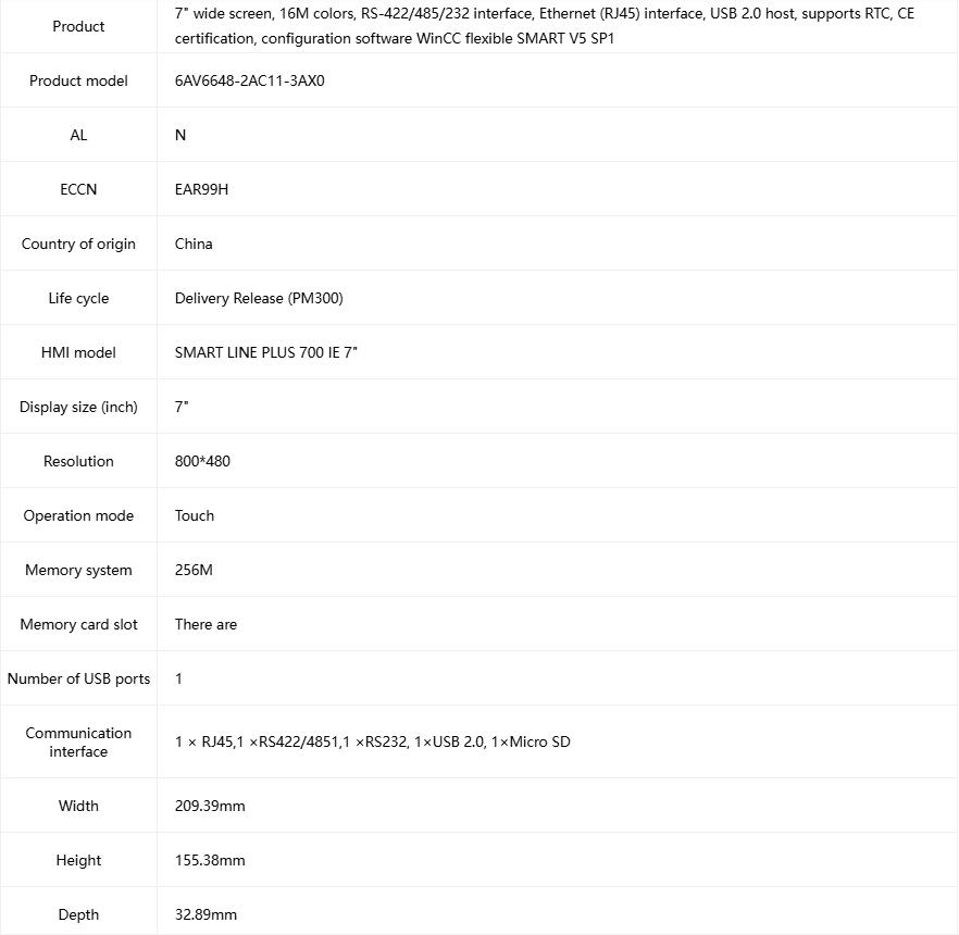 7″ wide screen, 16M colors, RS-422/485/232 interface, Ethernet (RJ45) interface, USB 2.0 host, supports RTC, CE certification, configuration software WinCC flexible SMART V5 SP1