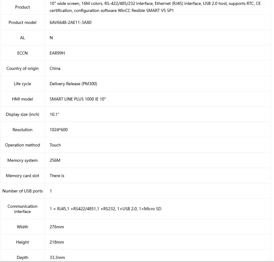 10″ wide screen, 16M colors, RS-422/485/232 interface, Ethernet (RJ45) interface, USB 2.0 host, supports RTC, CE certification, configuration software WinCC flexible SMART V5 SP1