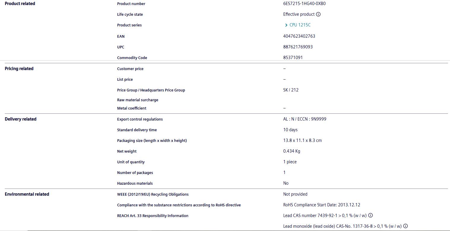 Siemens PLC 6ES7215-1HG40-0XB0 S7-1200 series programmable controller from Germany
