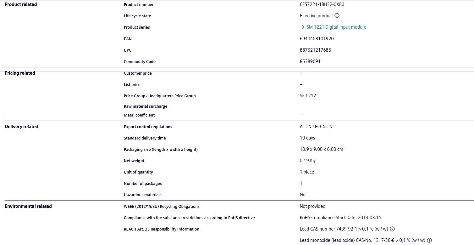 SIMATIC S7-1200, digital input SM 1221, 16 digital inputs, 24V DC, sinking current/sourcing current
