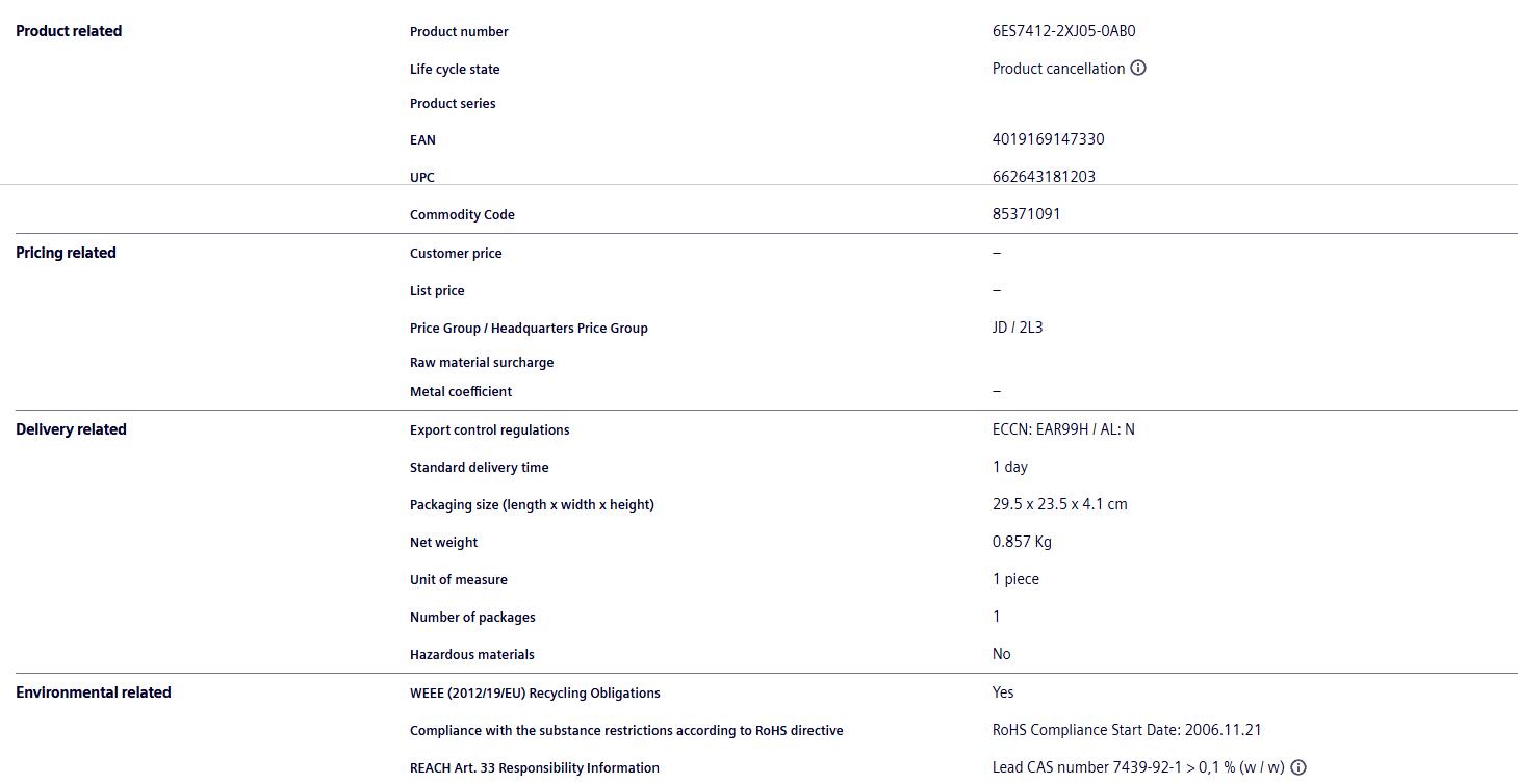 ********** Spare parts ********* SIMATIC S7-400, CPU 412-2 Central processing unit, with: Main memory 512 KB, (256 KB encoded, 256 KB data), 1. Interface MPI/DP 12 MBit/s, 2. Interface PROFIBUS DP