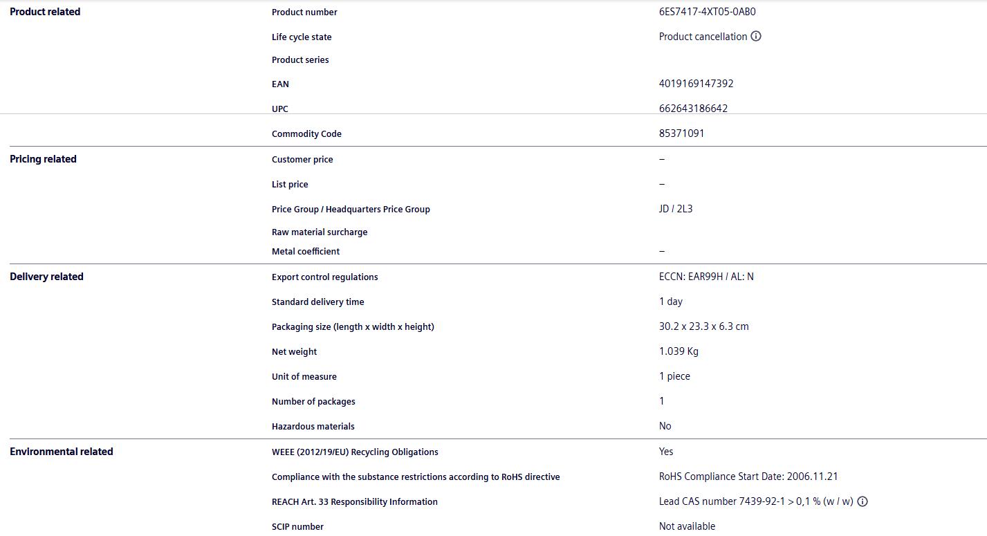 ********** Spare parts ********* SIMATIC S7-400, CPU 417-4 Central processing unit, with: Memory 30 MB, (15 MB code; 15 MB data) 1. Interface MPI 12 MBit/s; 2nd PROFIBUS DP interface, 3./4.SS IFM modules, plugable