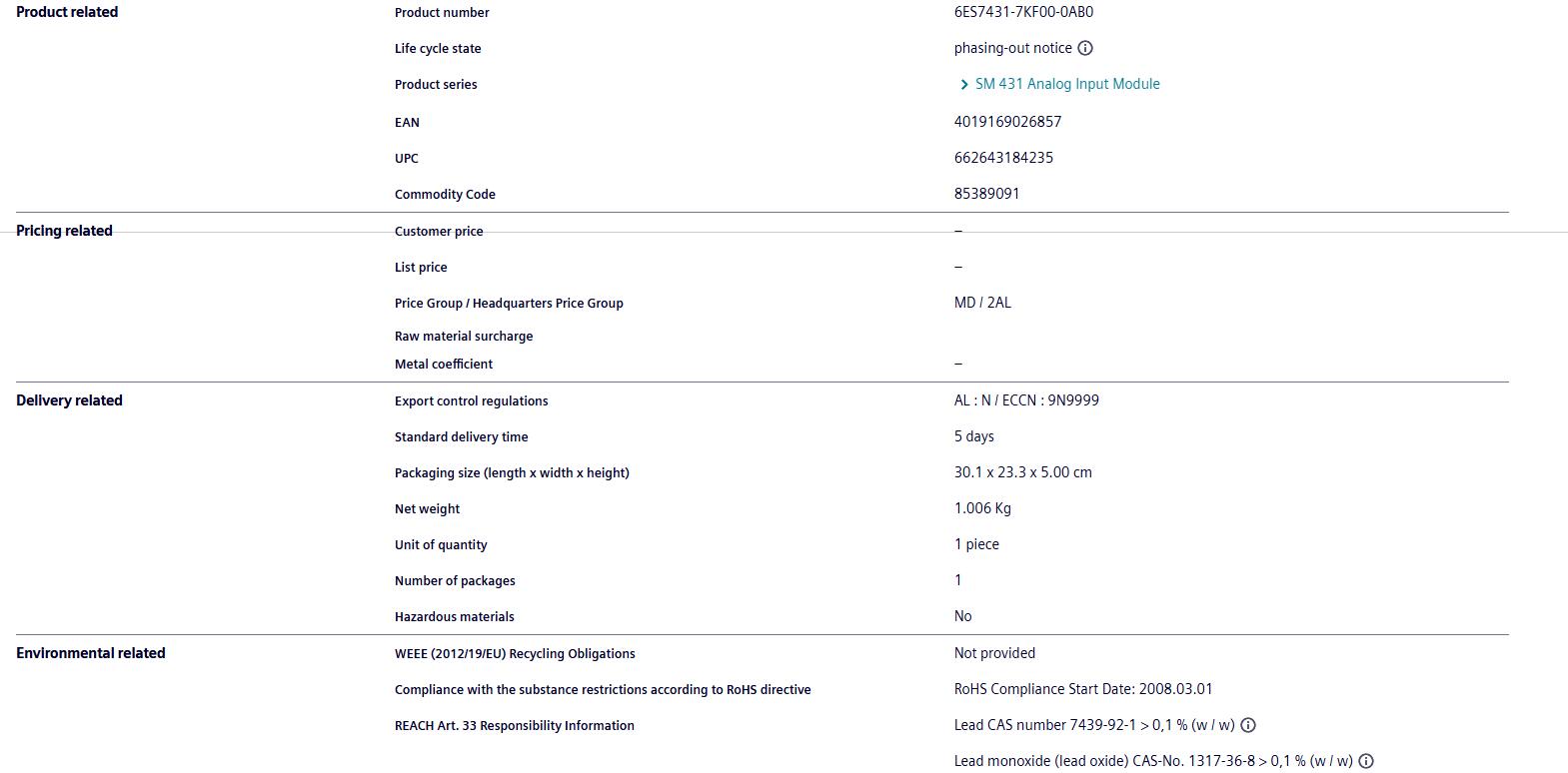 SIMATIC S7-400, analog input SM 431, 8 analog inputs; resolution 16 bit, U/I/thermocouple, potential isolation connected to common potential, diagnostics, alarms, 20 ms conversion time
