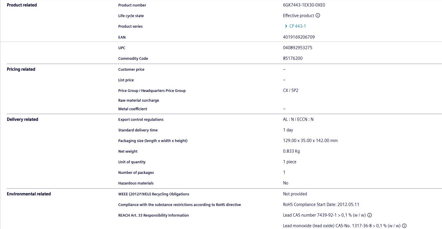 Communication processor CP 443-1; 2x 10/100 Mbit/s (IE switch); RJ 45 port; ISO; TCP; UDP; PROFINET IO controller; S7 communication; Open communication (send/receive); S7 routing; IP configuration via DHCP/module; IP Access Control (IP access control) list; Time synchronization; Extended network diagnostics; Supports quick start; PROFIenergy support;