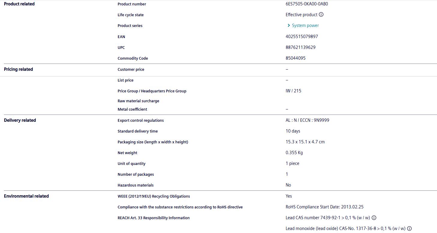 Sales of Siemens PLC module 6ES7505-0KA00-0AB0 S7-1500 Siemens power module