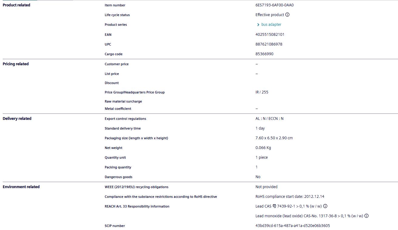 Siemens ET200 series bus adapter 6ES7193-6AF00-0AA0