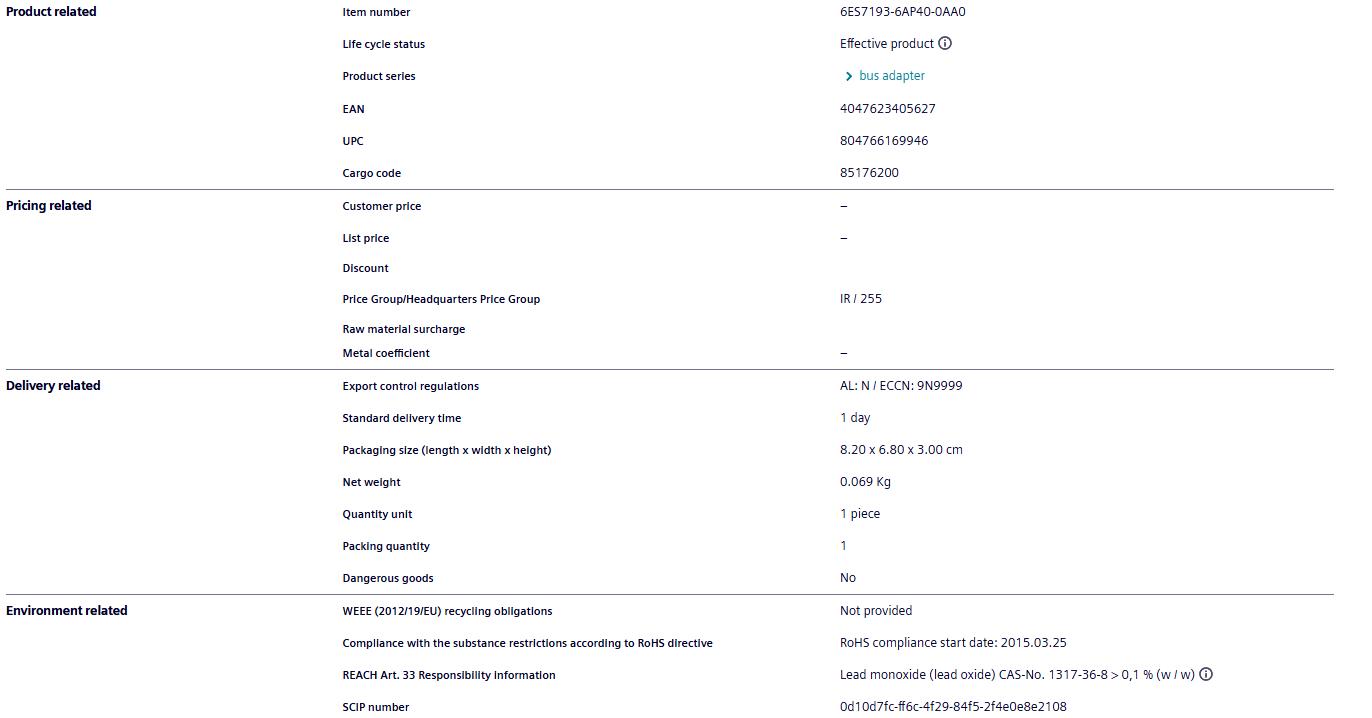 Siemens ET200 series bus adapter 6ES7193-6AP40-0AA0