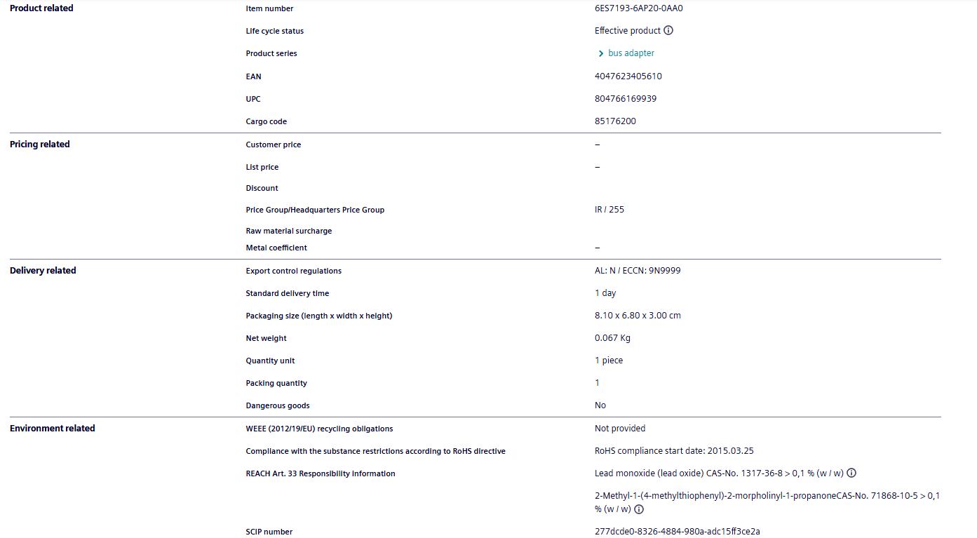Siemens ET200 series bus adapter 6ES7193-6AP20-0AA0