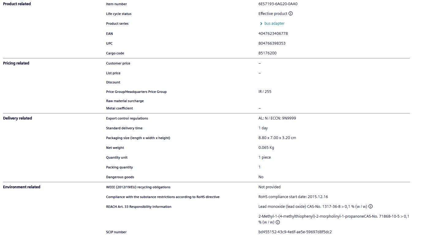 Siemens ET200 series bus adapter 6ES7193-6AG20-0AA0