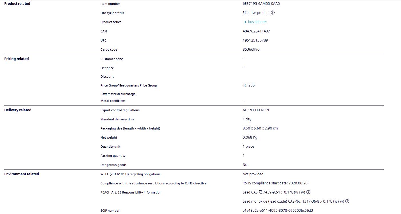 Siemens ET200 series bus adapter 6ES7193-6AM00-0AA0