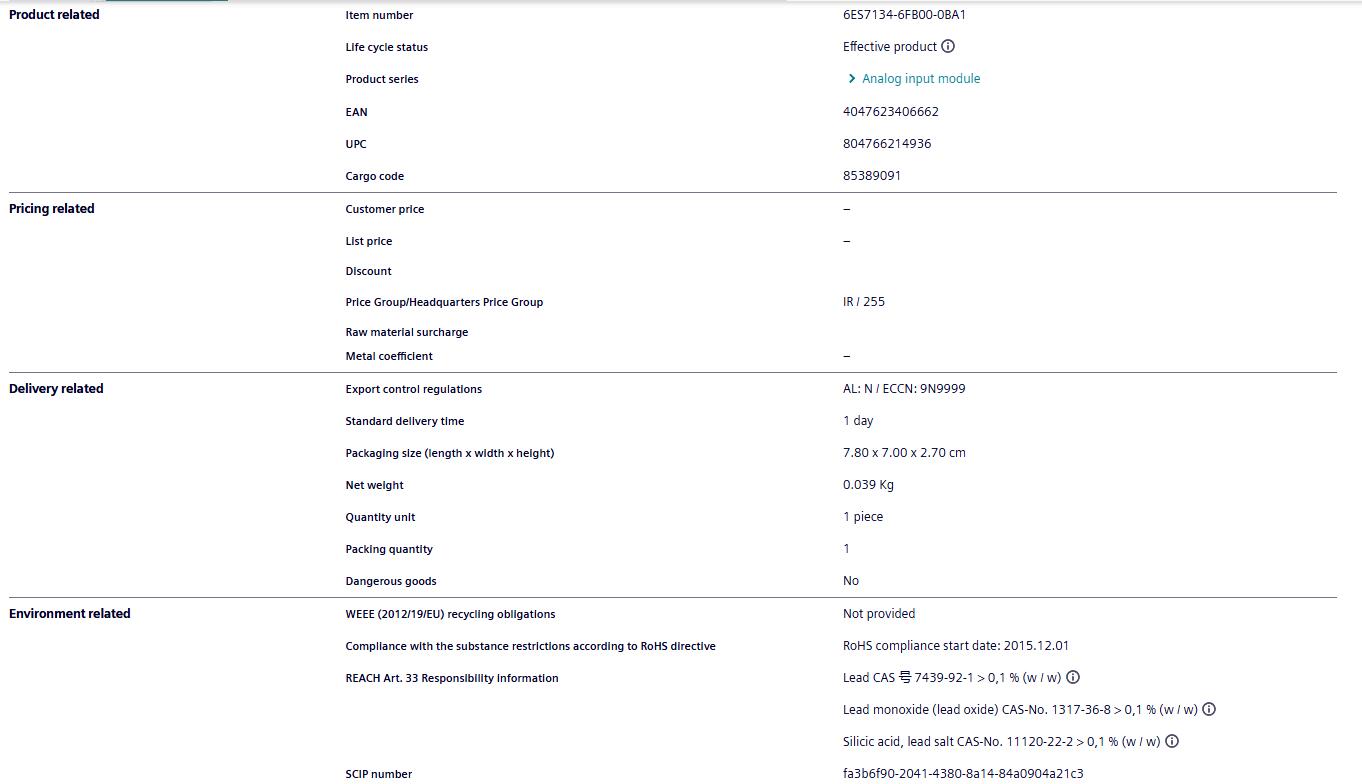 Sales of Siemens PLC module 6ES7134-6FB00-0BA1 analog input