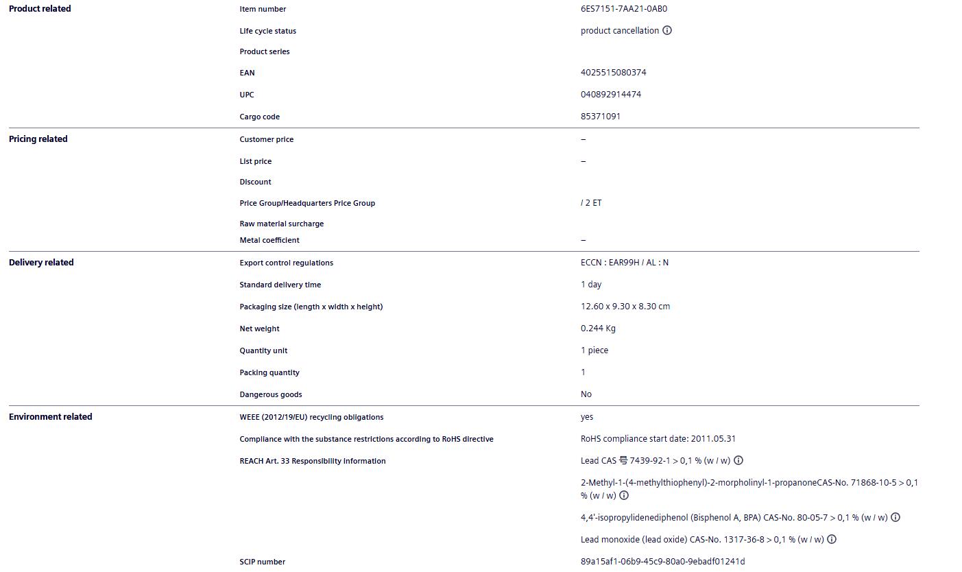 *** Spare part *** SIMATIC DP, IM151-7 CPU for ET200S, 128 KB work memory integrated PROFIBUS DP interface (9-pole Sub-D socket) SIMATIC MMC required as DP slave without battery
