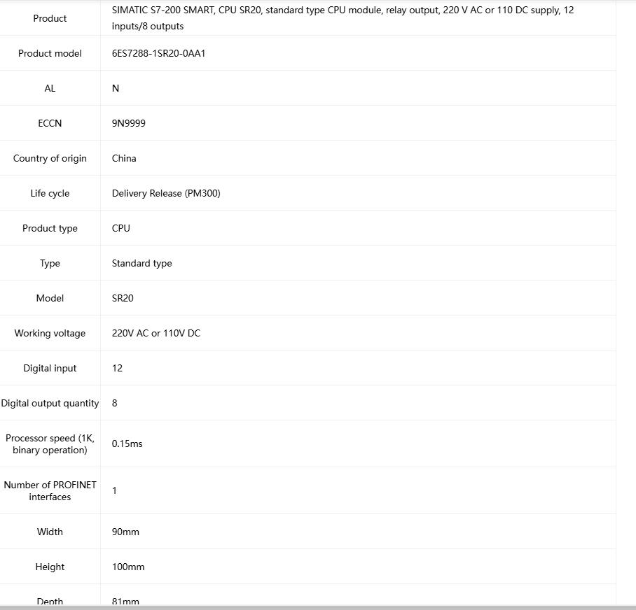 SIMATIC S7-200 SMART, CPU SR20, standard type CPU module, relay output, 220 V AC or 110 DC power supply, 12 inputs/8 outputs 6ES7288-1SR20-0AA1
