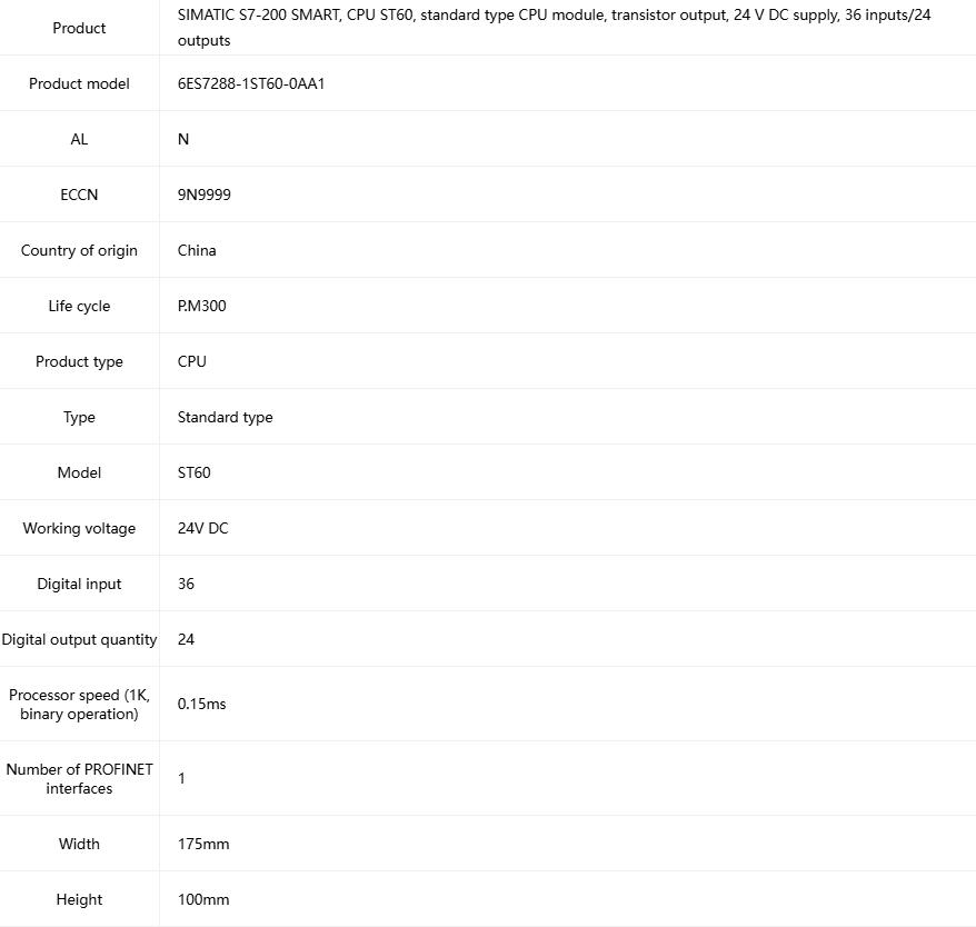 SIMATIC S7-200 SMART, CPU ST60, standard CPU module, transistor output, 24 V DC supply, 36 inputs/24 outputs 6ES7288-1ST60-0AA1